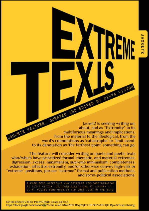 Jacket2 is seeking short scholarly articles, essays, belletristic documents, creative responses, and ephemera concerned with “Extreme Texts.” This call welcomes writing on, about, and as “Extremity” in its multifarious meanings and implications, from the material to the ideological, from the word’s connotations as “catastrophe” or “limit event” to its denotation as “the farthest point” something can go.