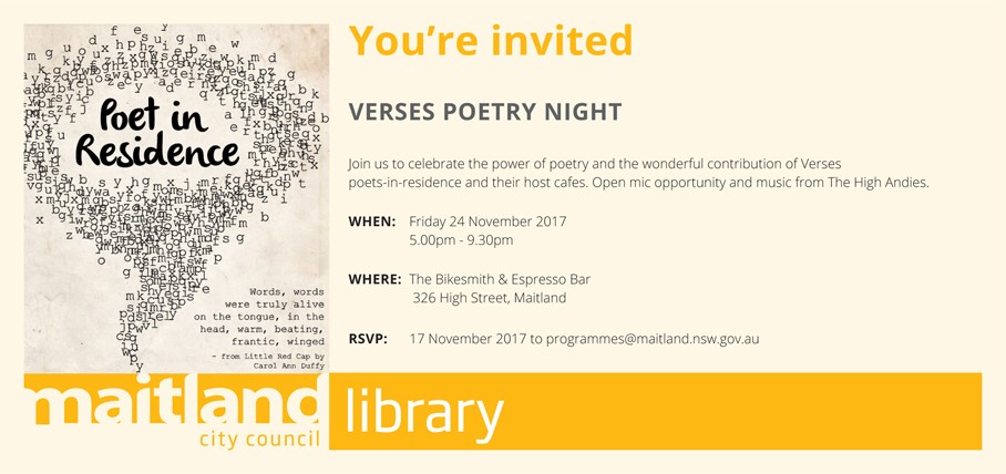 Please come and join us for a celebration of the Maitland Verses – Poets in Residence Program, there have been 10 poets and 8 cafes participate in the program to date.